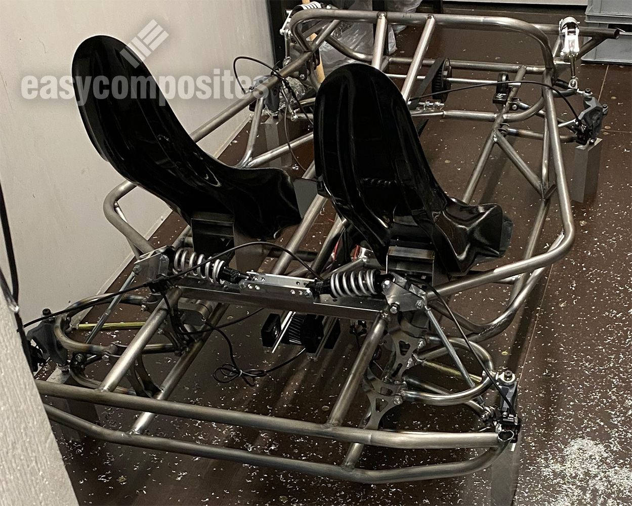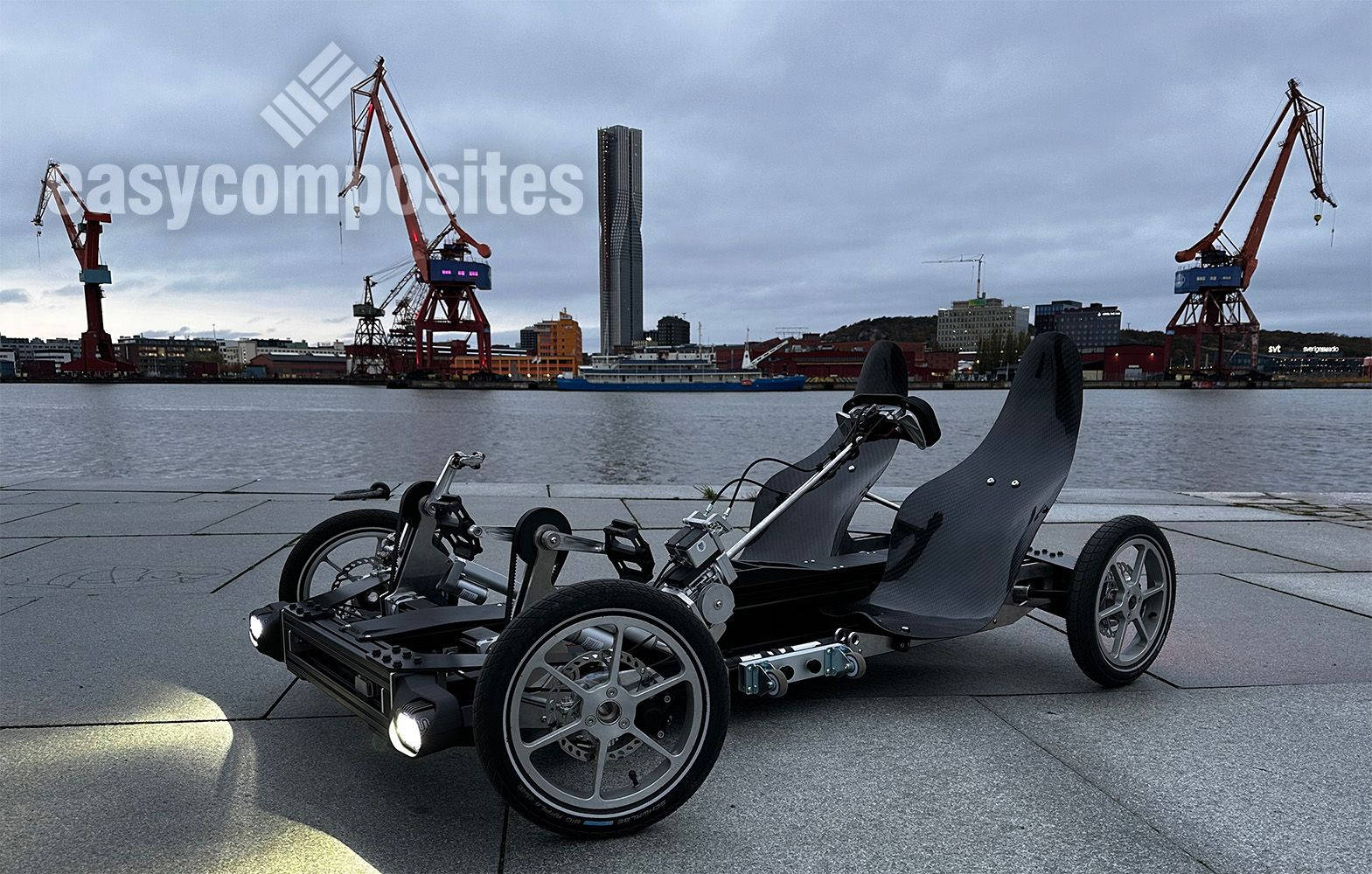 Het voertuig maakt gebruik van uitgebreide, op maat gemaakte onderdelen, waarbij alleen maatwerk goed genoeg was. Hier komen composietmaterialen goed van pas, omdat ze zich gemakkelijk aan specifieke vormen aanpassen en een ongelooflijke sterkte-gewichtsverhouding hebben. In het geval van dit project was een op maat gemaakte band cruciaal en daarom werd deze gegoten met flexibele PU-hars om zowel tijd als geld te besparen. Het volgende prototype voor productie zal worden voorzien van een carbon monocoque chassis.