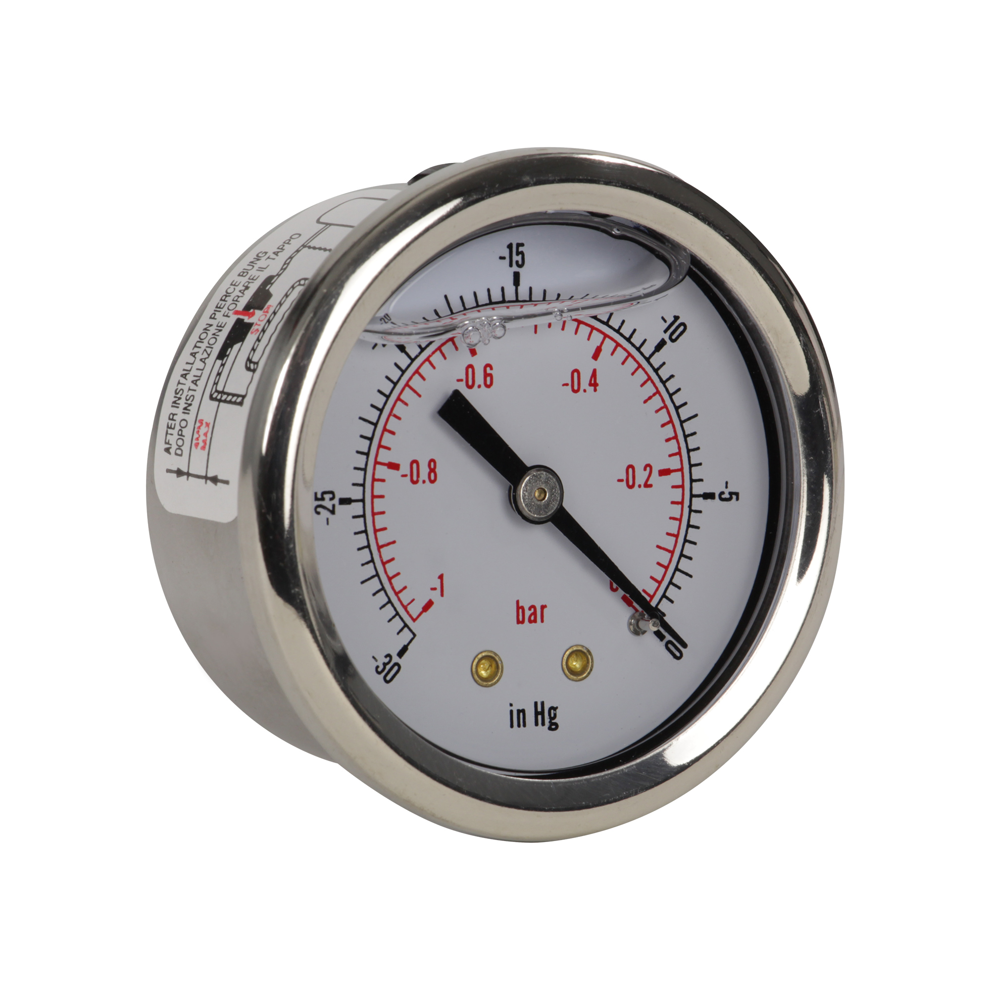 Please note that the glycerine in the gauge is not intended to fill the dial of the gauge to the very top. A small space at the top of the gauge needs to remain unfilled in order to allow internal pressure to be balanced with atmospheric pressure (see below).